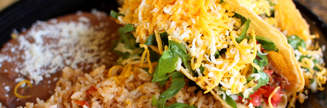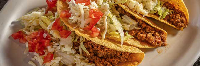 Our crispy tacos filled with ground beef or shredded chicken, lettuce, tomato, and cheese (crunchy taco shell only).